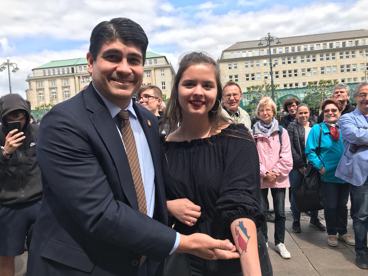 En ese momento, apareció Dinia Castillo, quien corrió hacia el mandatario agitando una bandera de Costa Rica. “Soy de Puntarenas y tengo 19 años de vivir en Hamburgo”, dijo emocionada tras abrazarlo y tomarse una foto con él.