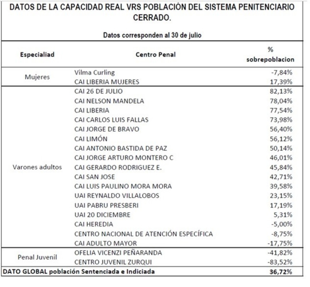 La tasa de hacinamiento global es de 36.72% (incluyendo Pensiones Alimentarias), tal y como se desglosa a continuación: