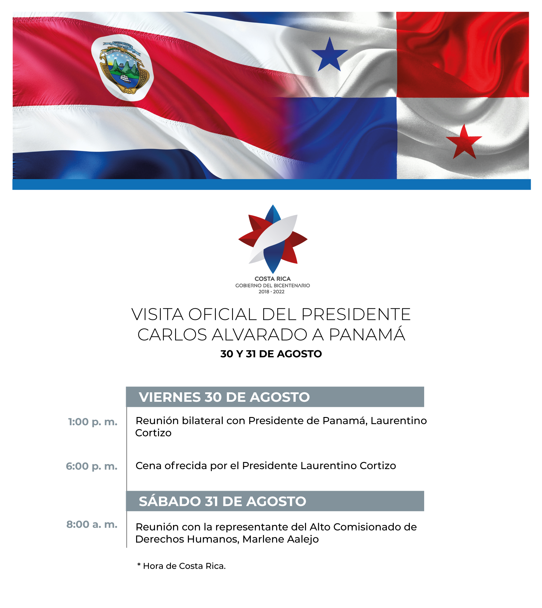 El presidente de la República, Carlos Alvarado, inicia este viernes una visita oficial a Panamá para reunirse con su homólogo panameño, Laurentino Cortizo, quien asumió el poder en julio anterior.
