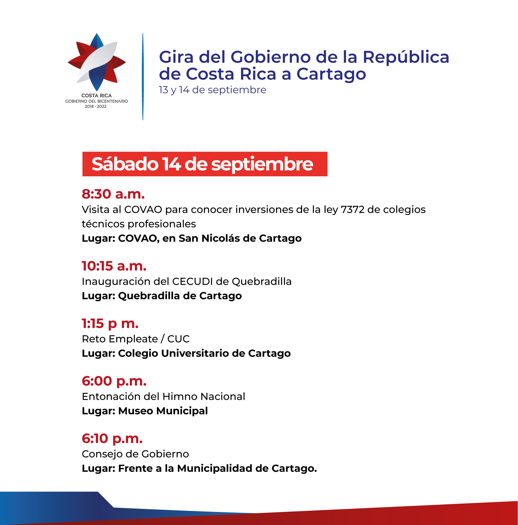 Finalmente, en la noche del sábado el mandatario participará en la entonación del himno Nacional de Costa Rica a las 6:00 p.m. en el Museo Municipal de Cartago con motivo del 198 aniversario de vida independiente, caminará en la marcha de los faroles junto a la Primera Dama, Claudia Dobles, niños y niñas hacia a las afueras de la Municipalidad de Cartago donde se realizará el Consejo de Gobierno Ampliado.