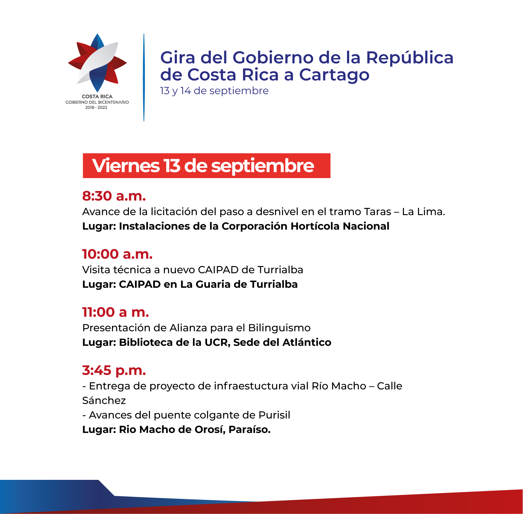 El presidente de la República, Carlos Alvarado, iniciará este viernes una gira de dos días por la provincia de Cartago que lo llevará al cantón Central,  Turrialba y Paraíso en el marco de las actividades conmemorativas del 198 aniversario de la Independencia de Costa Rica.