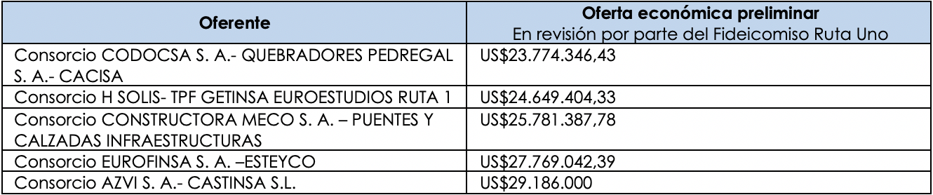 A partir de la apertura de las ofertas, el Fideicomiso Ruta Uno cuenta con un máximo de 60 días hábiles para hacer el análisis técnico y legal de cada oferta, con el objetivo de verificar que cada una cumpla los requisitos establecidos en el cartel de contratación. Será adjudicado aquel consorcio que, cumpliendo con los requisitos, oferte el menor precio.