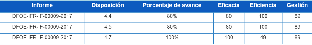 En el caso de JAPDEVA, el ente contralor evalúo el proceso de mejora y acatamiento de las disposiciones en los informes desde 2017 de su función de supervisión de la Terminal de Contenedores de Moín. Ver cuadro adjunto.